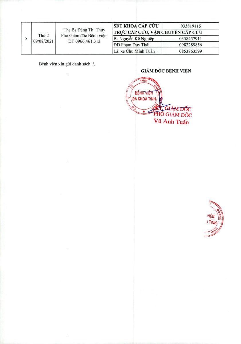 Danh sách kíp trực cấp cứu ngoài bệnh viện và chuyển tuyến cấp cứu từ ngày 02/08 đến ngày 09/08/2021