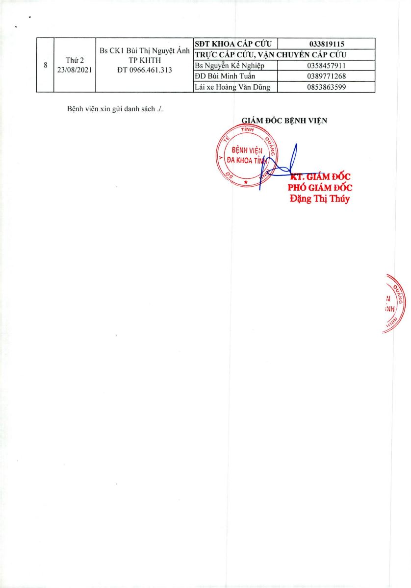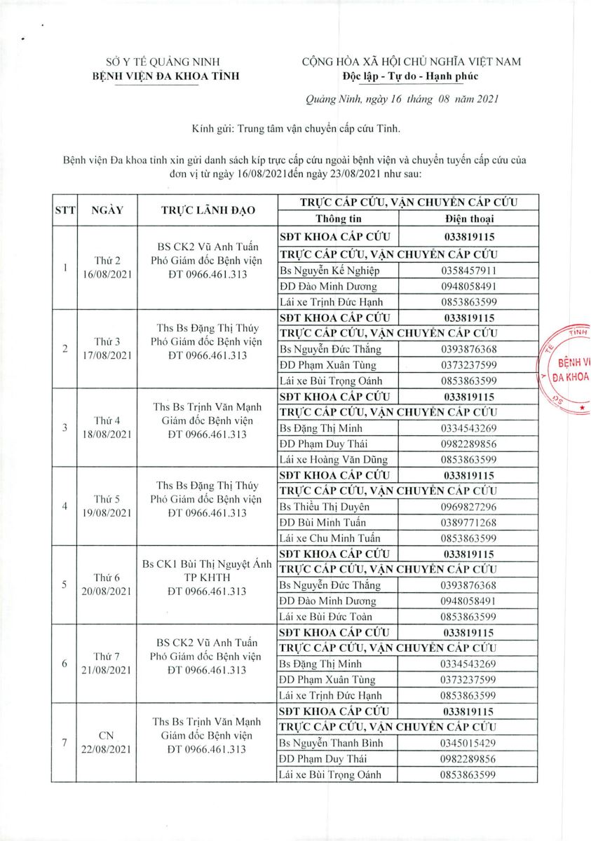 - Danh sách kíp trực cấp cứu ngoài bệnh viện và chuyển tuyến cấp cứu từ ngày 09/08 đến ngày 16/08/2021