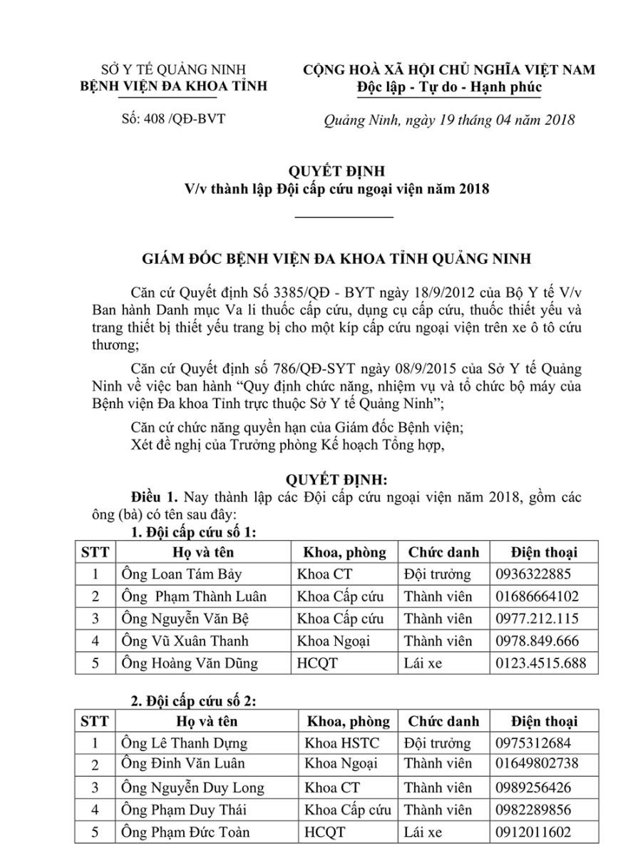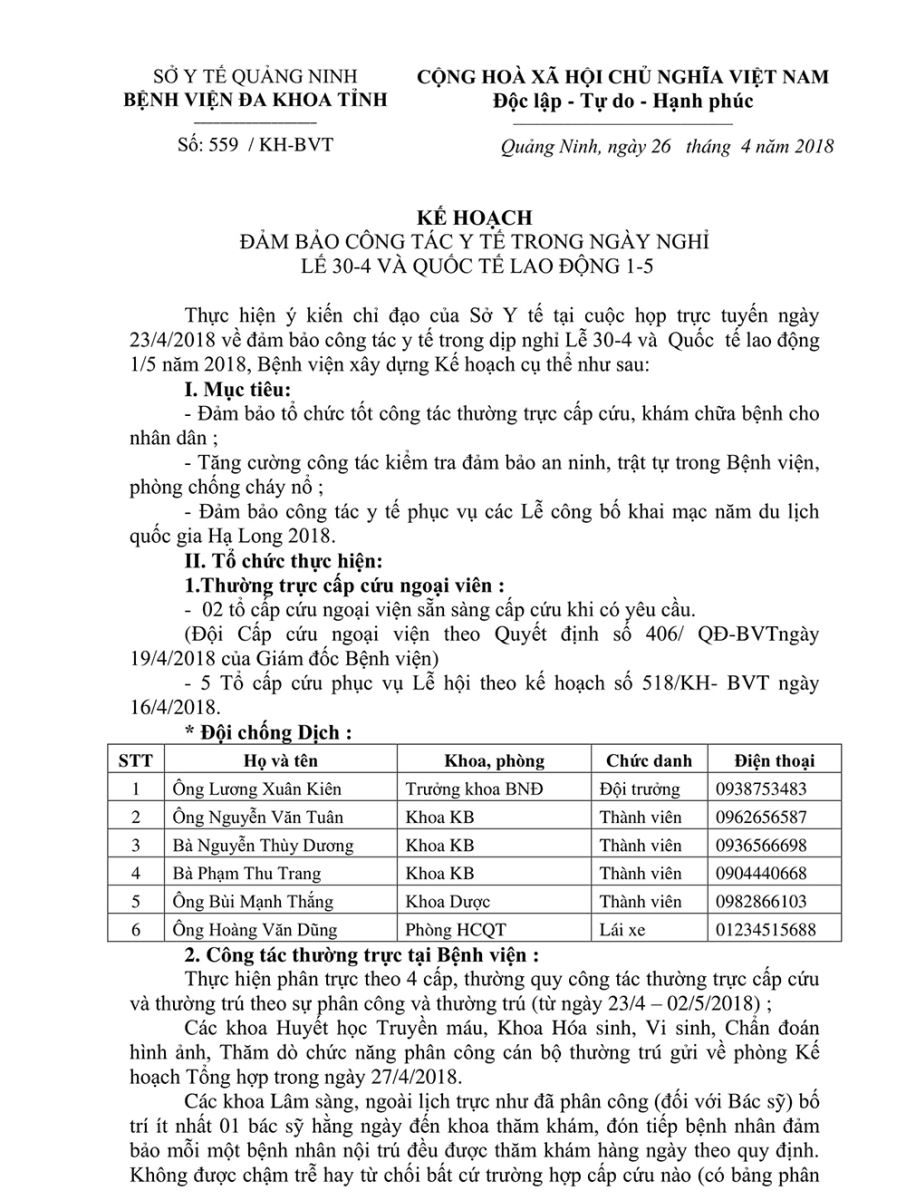 Bệnh viện Đa khoa tỉnh Quảng Ninh đã xây dựng kế hoạch số 559/KH-BVT ngày 26/4/2018 để đảm bảo tổ chức tốt công tác thường trực cấp cứu, khám chữa bệnh cho nhân dân, cũng như các công tác y tế phục vụ Lễ khai mạc năm du lịch quốc gia Hạ Long 2018 trong dịp nghỉ lễ 30/4 và 1/5.