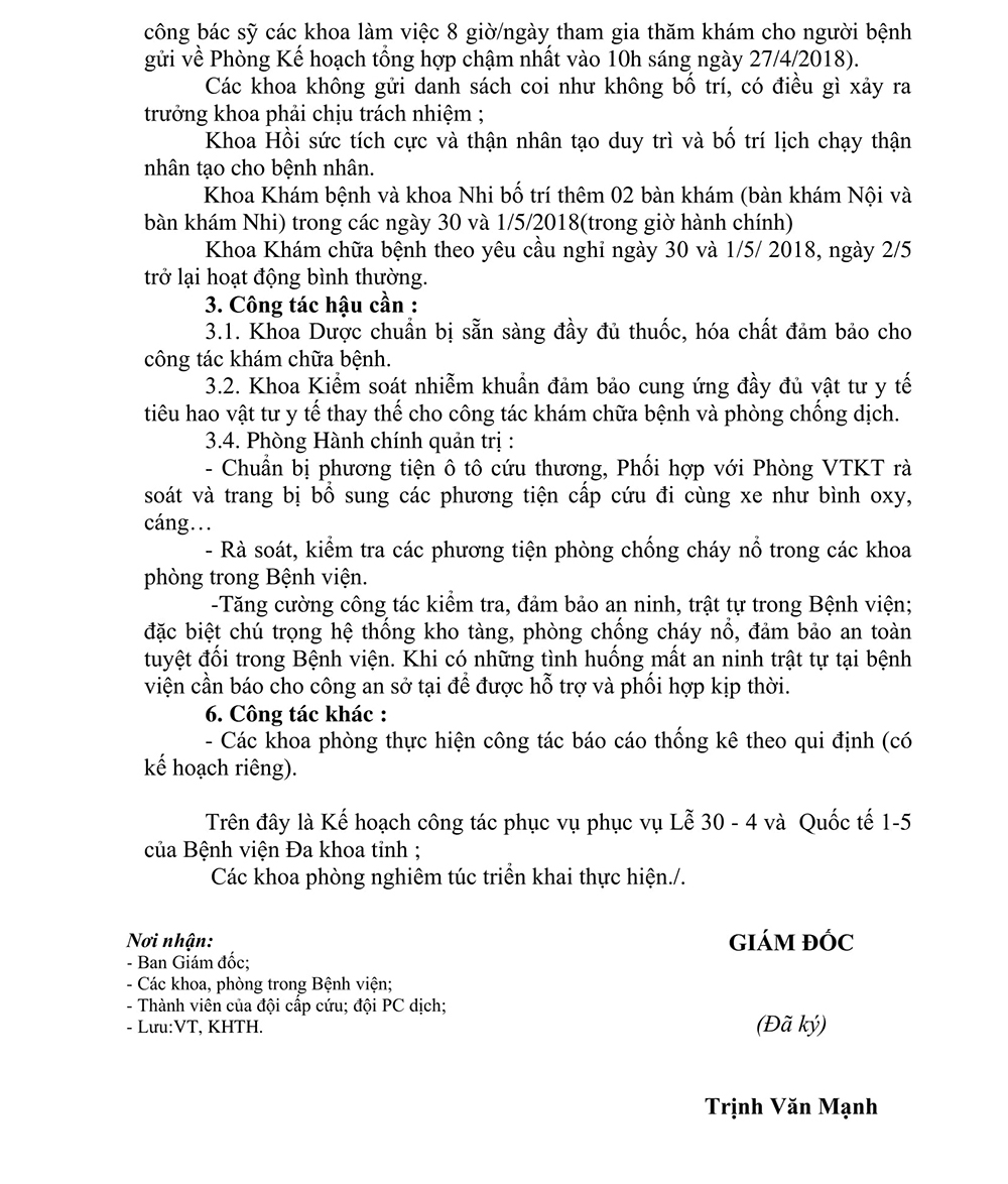 1. Kế hoạch đảm bảo công tác y tế trong ngày nghỉ lễ 30/4 và 1/5