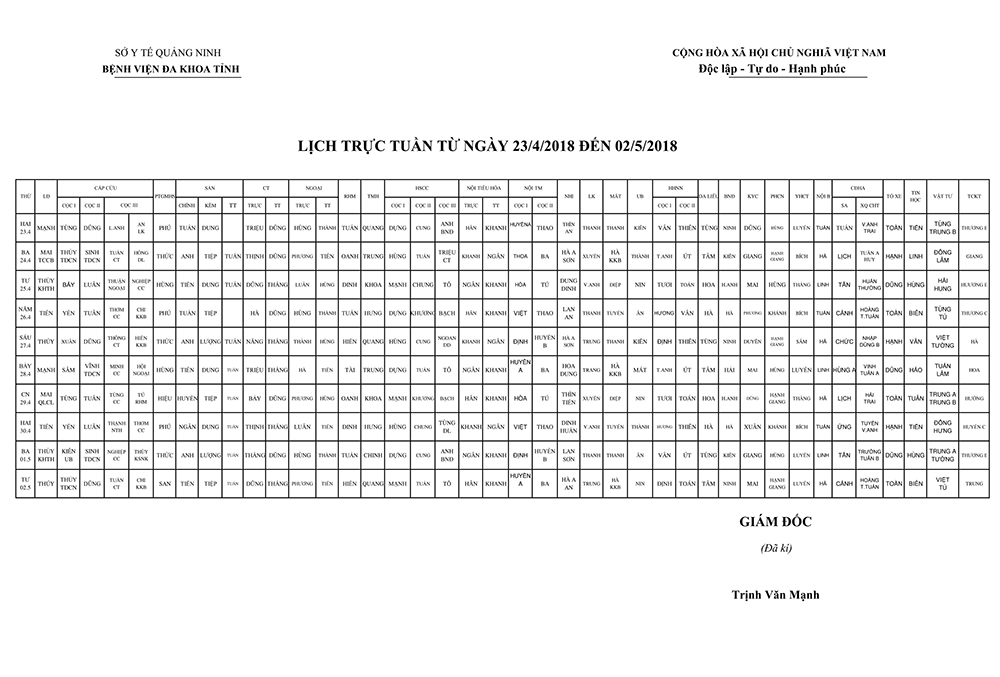 2. Lịch trực tuần từ ngày 23/4 đến 2/5/2018