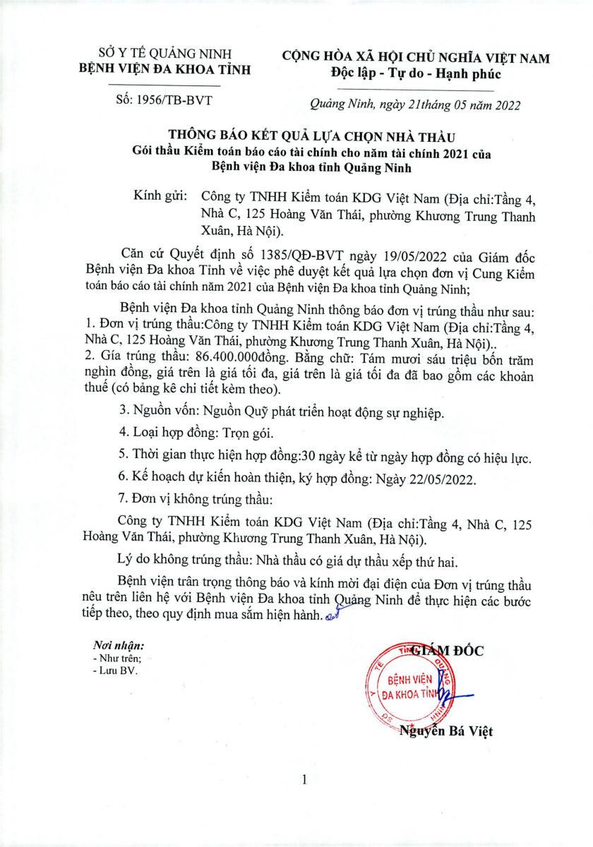 Thông báo kết quả lựa chọn nhà thầu: Gói thầu Kiểm toán báo cáo tài chính cho năm tài chính 2021 của Bệnh viện Đa khoa tỉnh Quảng Ninh