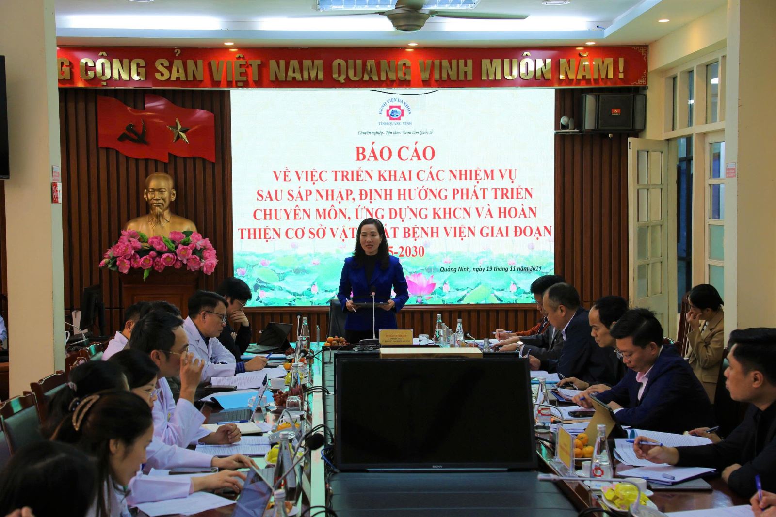 Chiều ngày 19 tháng 11 năm 2025, tại Bệnh viện Đa khoa tỉnh Quảng Ninh, Ủy ban nhân dân (UBND) tỉnh đã tổ chức Hội nghị quan trọng nhằm đánh giá tình hình triển khai các nhiệm vụ sau sáp nhập, đồng thời định hướng phát triển chuyên môn, ứng dụng khoa học công nghệ (KHCN) và công tác hoàn thiện cơ sở vật chất của Bệnh viện giai đoạn 2025-2030. Đồng chí Nguyễn Thị Hạnh- Phó Chủ tịch UBND tỉnh Quảng Ninh dự và chủ trì Hội nghị.