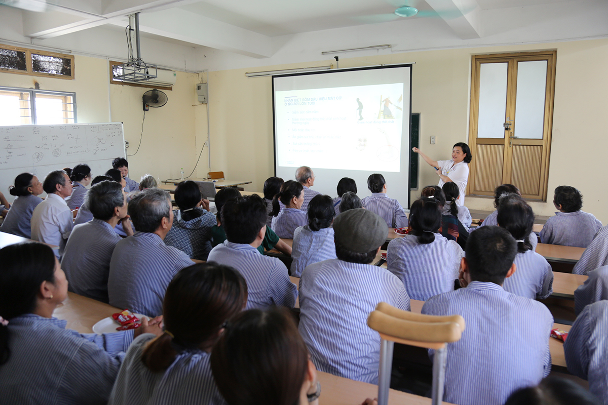 Tại buổi tư vấn, ĐD Trần Thị Thu Hương - Trưởng khoa Dinh Dưỡng khẳng định: Chế độ dinh dưỡng rất quan trọng đối với việc điều trị và hồi phục bệnh. Những bệnh nhân mắc các bệnh lý phải nằm viện thường thể trạng yếu ớt, mệt mỏi, dễ sút cân nên việc bổ sung dinh dưỡng cân bằng, phù hợp qua đường ăn uống sẽ giúp người bệnh mau lành, sức khỏe phục hồi nhanh chóng và giảm tỷ lệ tái nhập viện. Bên cạnh đó, Trưởng khoa Dinh dưỡng đã cung cấp, bổ sung thông tin, cập nhật kiến thức khoa học mới nhất qua bài giảng về vai trò của khối cơ trong duy trì sức khỏe ở người lớn tuổi, tìm hiểu những nguyên nhân gây mất khối cơ và hậu quả của mất khối cơ đối với người bệnh, nhất là ở người cao tuổi, từ đó sẽ giúp bệnh nhân nhận biết sớm tình trạng mất cơ để có những giải pháp phù hợp trong ăn uống, sinh hoạt và bổ sung dưỡng chất nhằm hạn chế việc mất cơ xảy ra.