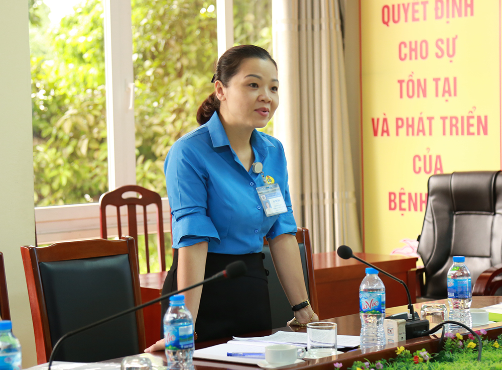 Đồng chí Vũ Thị Mai - Chủ tịch Công đoàn Bệnh viện báo cáo đoàn kiểm tra