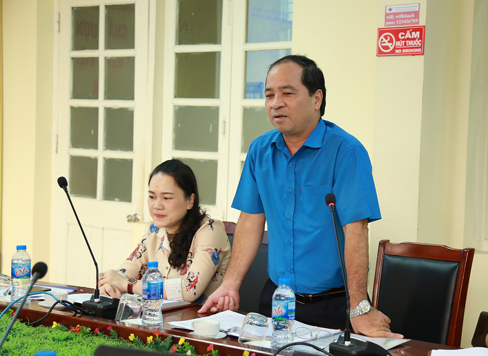 Đồng chí Phạm Hoài Ân - Ủy viên Ban thường vụ, Chủ nhiệm Uỷ ban kiểm tra Liên đoàn Lao động Tỉnh phát biểu tại buổi làm việc