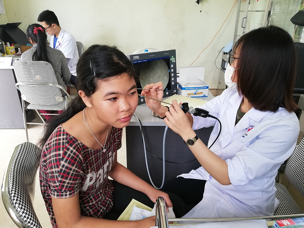 Bác sĩ cẩn thận nội soi kiểm tra tai cho người dân đến khám