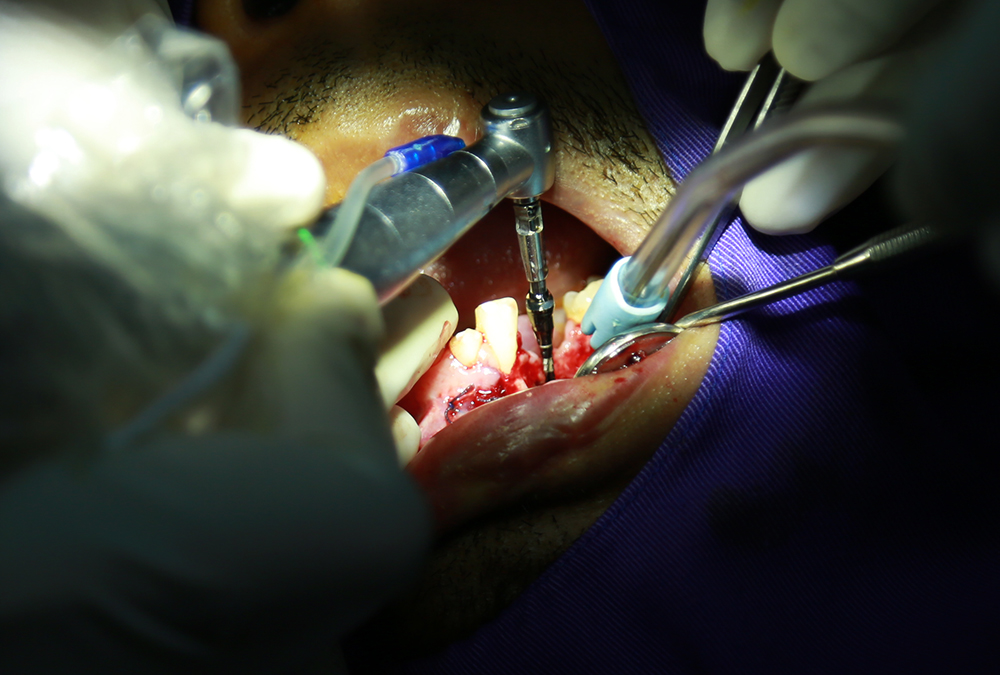 Bác sĩ CKI Bùi Công Tuấn – Phó Trưởng khoa Răng hàm mặt cùng kíp phẫu thuật thực hiện kỹ thuật ghép bột xương nhân tạo và cấy 2 trụ implant cho bệnh nhân.