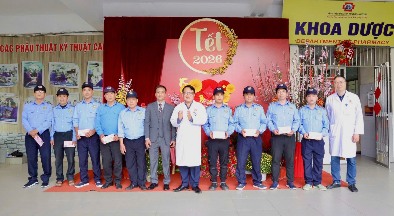 Ths.BsCKII Nguyễn Bá Việt- Giám đốc Bệnh viện Đa khoa tỉnh kiểm tra công tác đảm bảo an ninh trật tự, gửi lời chúc mừng và lì xì năm mới cho ekip vệ sỹ bệnh viện.