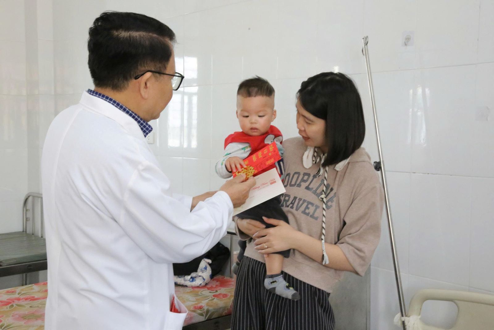 Ths.BsCKII Nguyễn Bá Việt- Giám đốc Bệnh viện Đa khoa tỉnh động viên, chúc mừng và lì xì năm mới cho ekip trực tại Khoa Hồi sức tích cực- Chống độc- TNT.