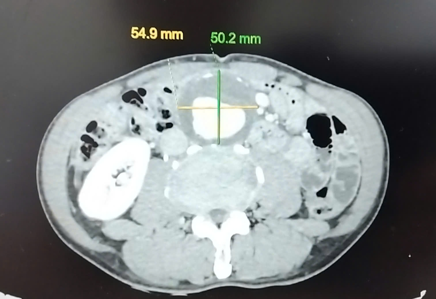 Bệnh nhân P.Q.H (76 tuổi), trú tại phường Hà Lầm, tỉnh Quảng Ninh, có tiền sử ung thư dạ dày đã phẫu thuật và điều trị hóa chất cách đây 15 năm. Thời gian gần đây, bệnh nhân sờ thấy khối vùng quanh rốn, kèm đau tức hạ sườn phải, nên đến khám tại khoa Ung bướu, Bệnh viện Đa khoa tỉnh. Tại đây, các bác sĩ thăm khám thấy bệnh nhân có một khối to ở cạnh rốn và đập theo nhịp mạch. Trên hình ảnh chụp cắt lớp vi tính động mạch chủ chậu thấy khối phình động mạch chủ bụng đoạn dưới thận hình thoi có kích thước 5,1x5,5 cm, khối phình động mạch chậu chung 2 bên, kèm nhiều huyết khối trong túi phình, đồng thời phát hiện thêm sỏi ống mật chủ kích thước 8mm, giãn ống mật chủ.