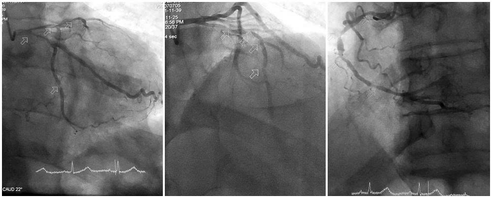 Với sự đồng thuận của gia đình, người bệnh lập tức được chuyển đến phòng can thiệp trong tình trạng huyết động không ổn định, chức năng tim suy giảm rõ rệt, đòi hỏi phải xử trí khẩn trương và chính xác. Kết quả chụp mạch vành cho thấy mức độ tổn thương nặng cả ba thân động mạch vành. Động mạch liên thất trước hẹp tới 90–99%, gần như tắc hoàn toàn; động mạch mũ và động mạch vành phải hẹp 80–90%, thành các mạch vôi hóa nhiều.