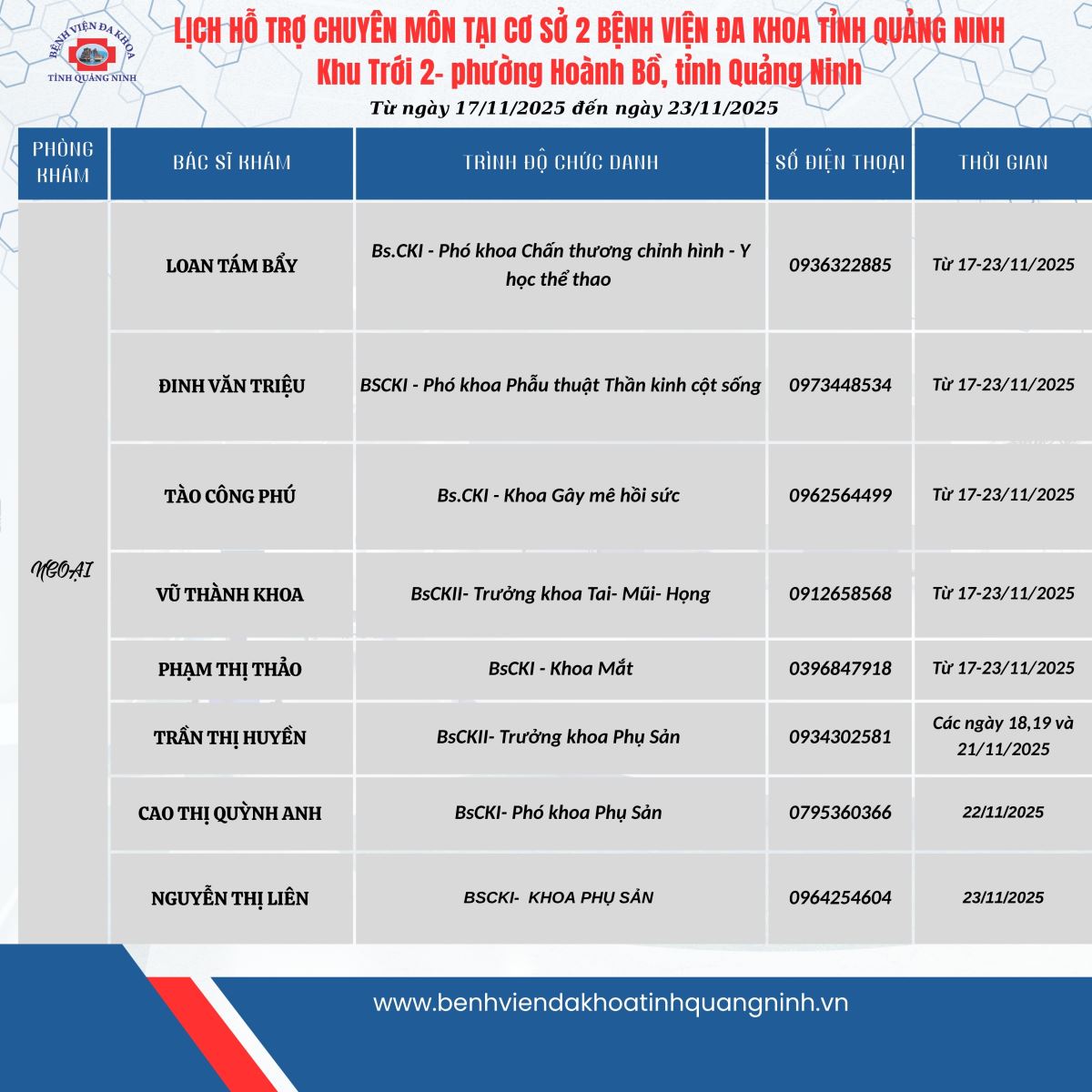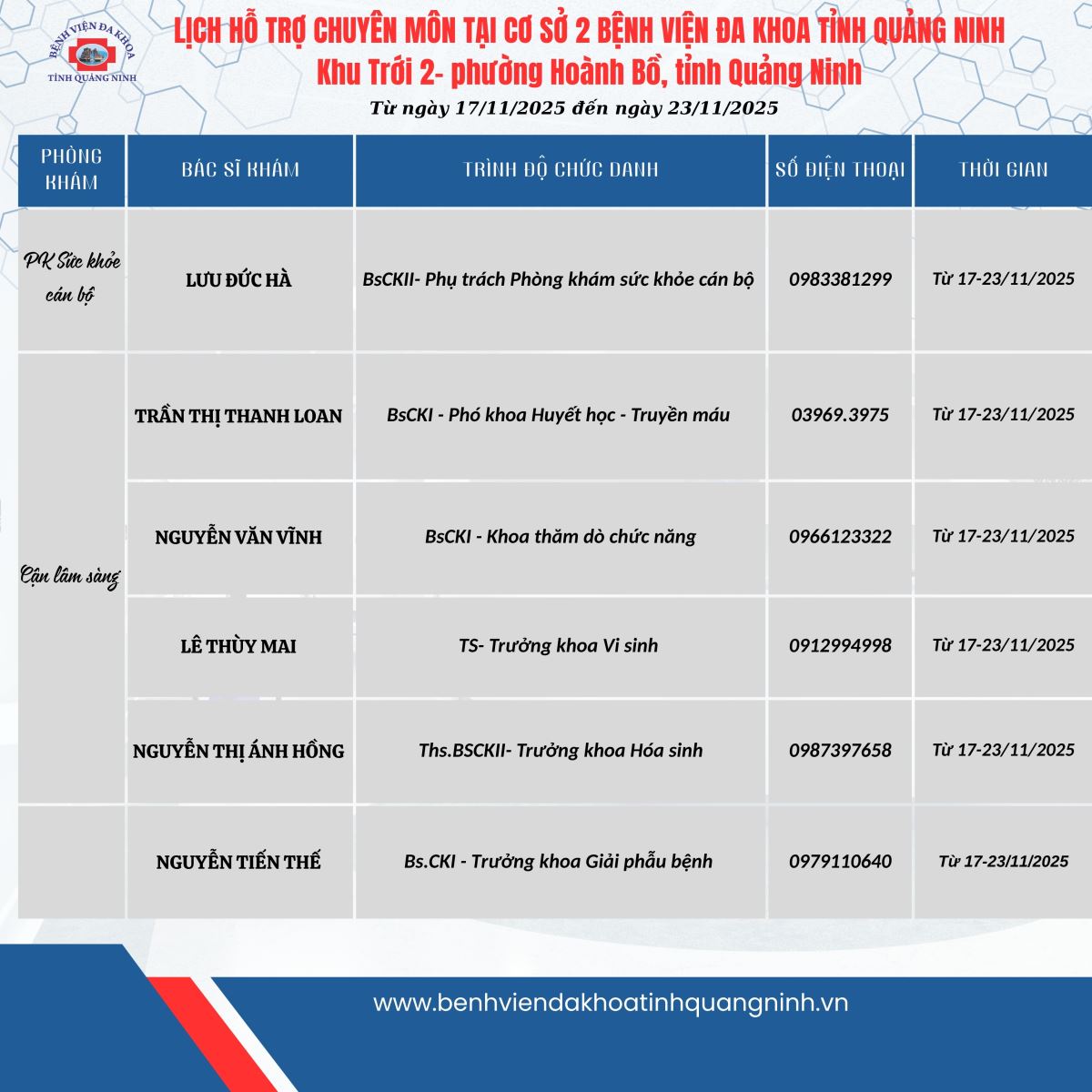 Bệnh viện Đa khoa tỉnh Quảng Ninh xin thông báo danh sách nguồn nhân lực chất lượng cao tăng cường từ cơ sở chính tới làm việc tại cơ sở 2 để phục vụ nhu cầu thăm khám, điều trị và chăm sóc sức khỏe cho nhân dân và các quý khách hàng, đối tác của bệnh viện được biết.