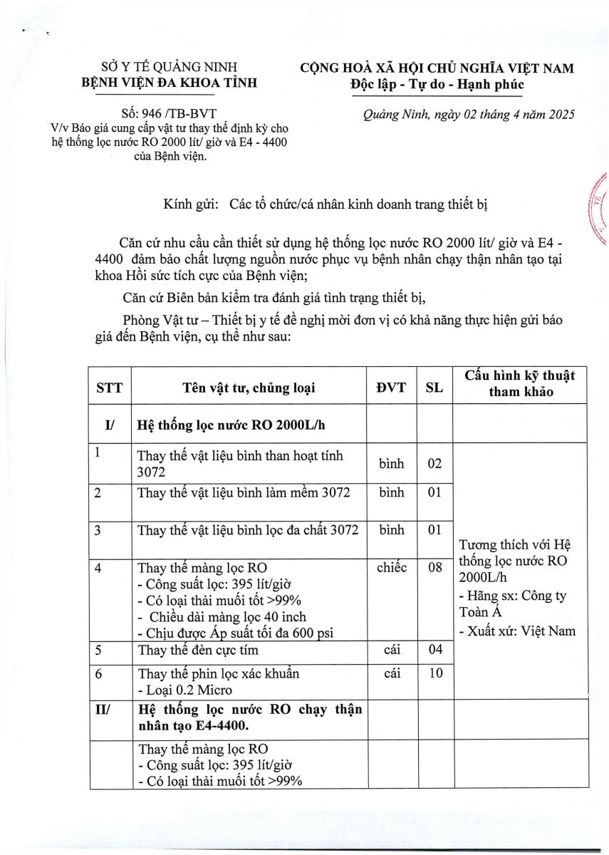 Báo giá cung cấp vật tư thay thế định kỳ cho hệ thống lọc nước RO của bệnh viện (946)