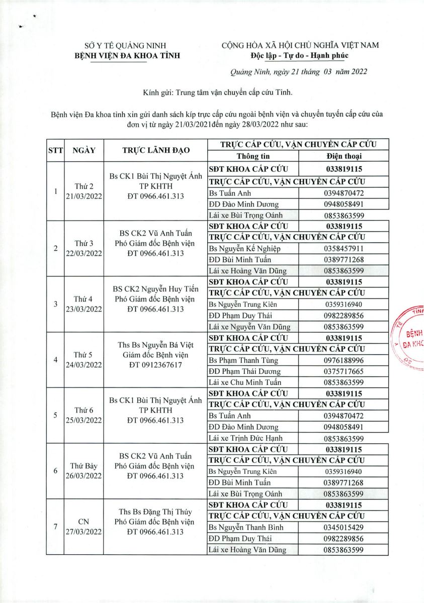 - Danh sách kíp trực cấp cứu ngoài bệnh viện và chuyển tuyến cấp cứu từ ngày 14/03 đến ngày 21/03/2022