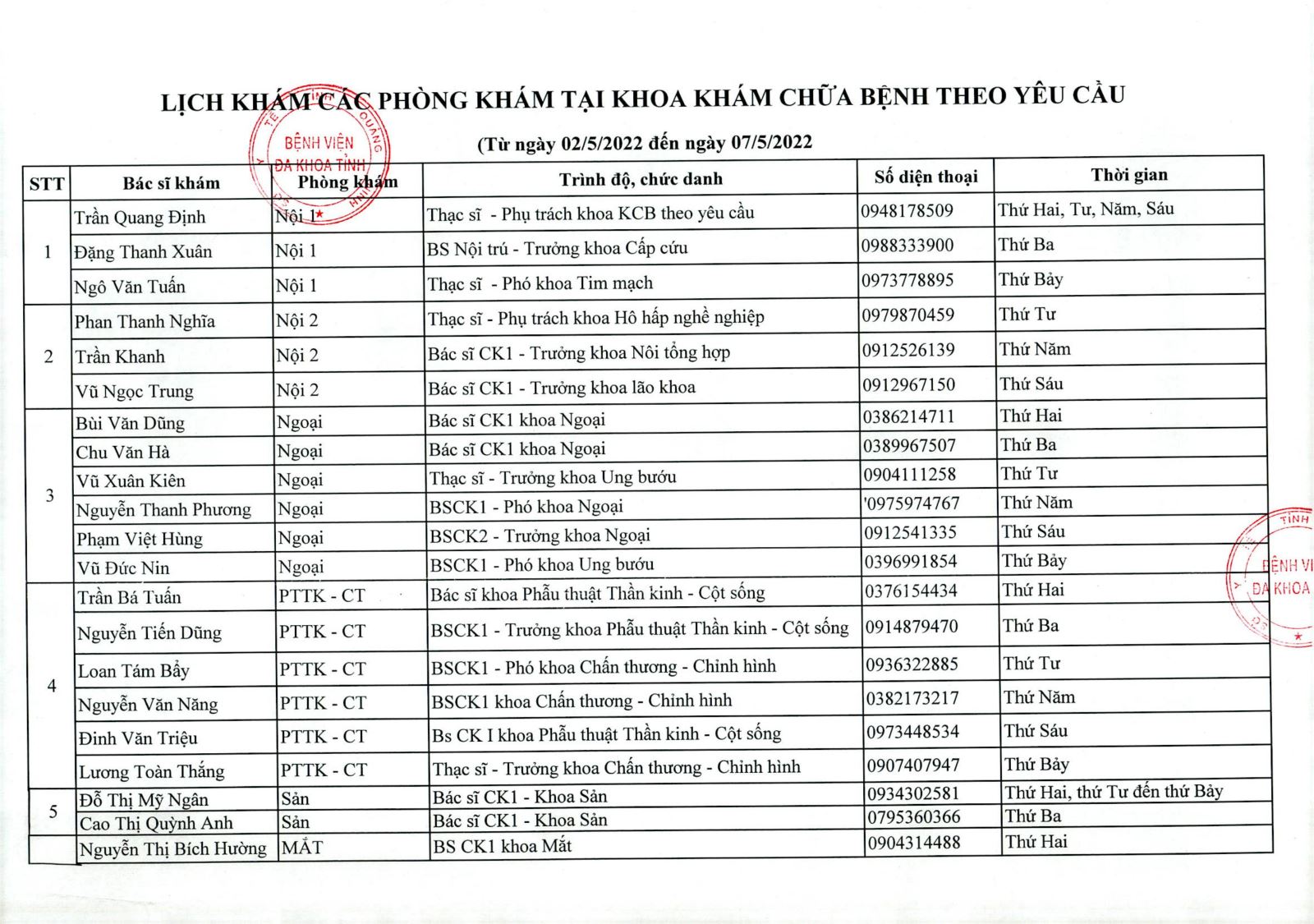 KHOA KHÁM CHỮA BỆNH THEO YÊU CẦU ( từ ngày 02/05/2022 đến ngày 07/05/2022)