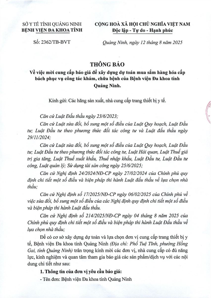 Mời báo giá cung cấp báo giá xây dựng dự toán mua sắm hàng hoá cấp bách phục vụ công tác khám, chữa bệnh (2362)
