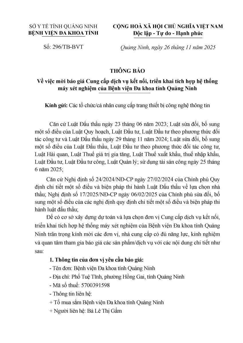 Mời báo giá cung cấp dịch vụ kết nối, triển khai tích hợp hệ thống máy xét nghiệm (296)