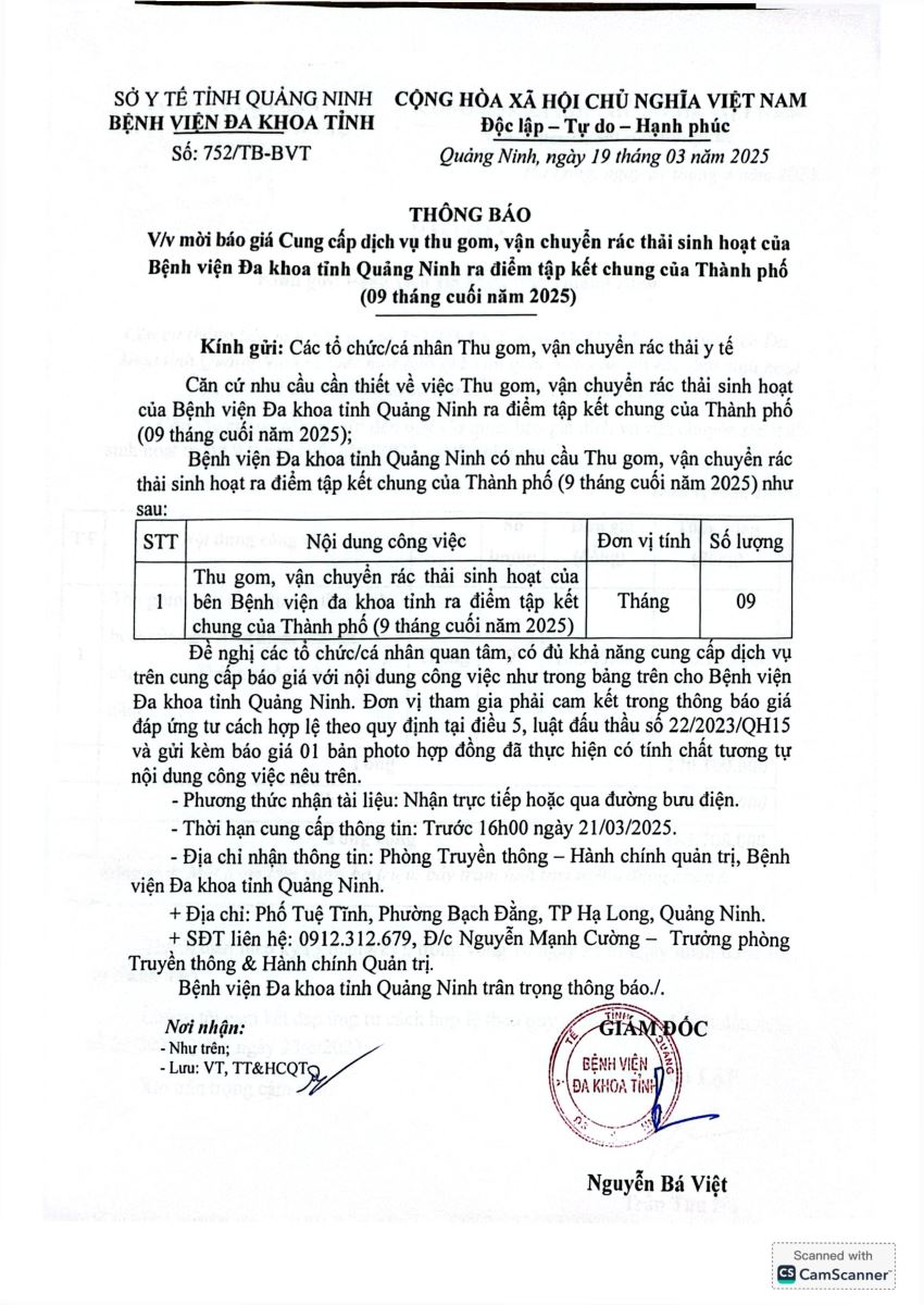 Mời báo giá cung cấp dịch vụ thu gom, vận chuyển rác thải sinh hoạt (752)