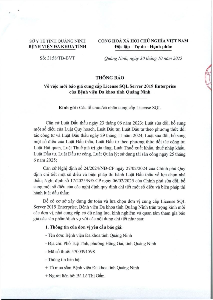 Mời báo giá cung cấp license SQL Server 2019 Enterpirse của bệnh viện (3158)