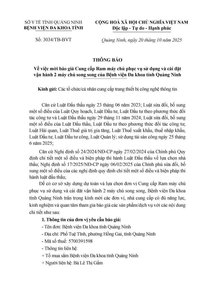 - Mời cung cấp báo giá Ram máy chủ của bệnh viện (2765)