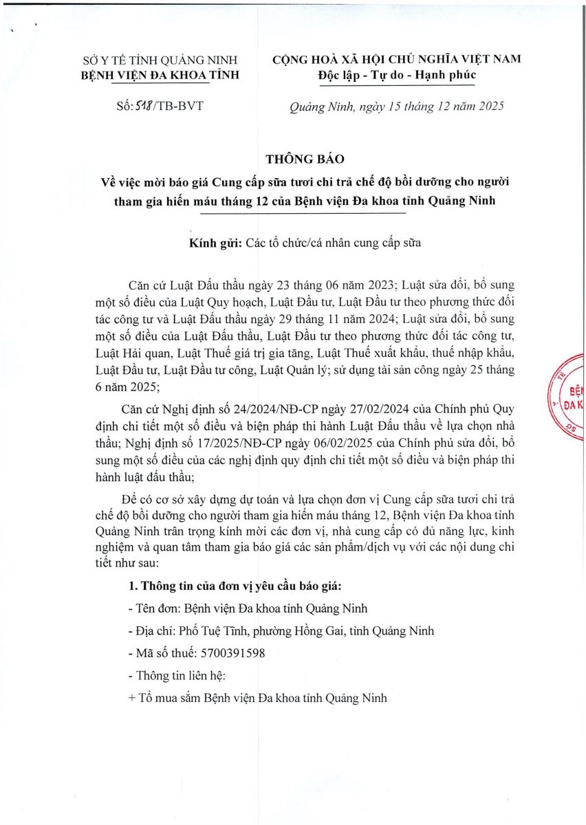 Mời báo giá cung cấp sữa tươi chi trả chế độ bồi dưỡng cho người hiến máu (518)