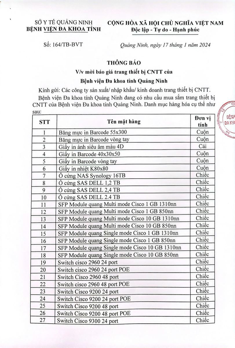 Mời báo giá cung cấp trang thiết bị CNTT (Báo giá 164)