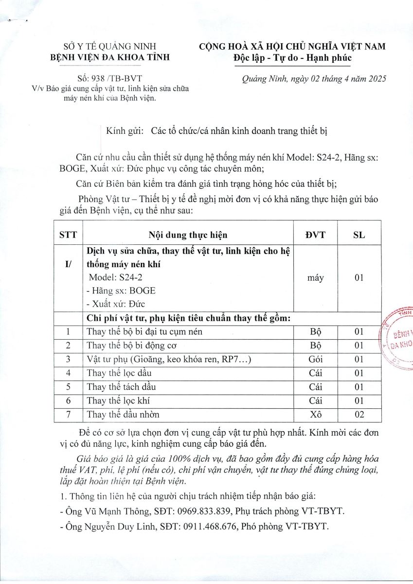 Mời báo giá cung cấp vật tư, thiết bị để sửa chữa, thay thế cho hệ thống máy nén khí S24-2, máy hút Gardner Denver tại TT khí y tế của bệnh viện (938)