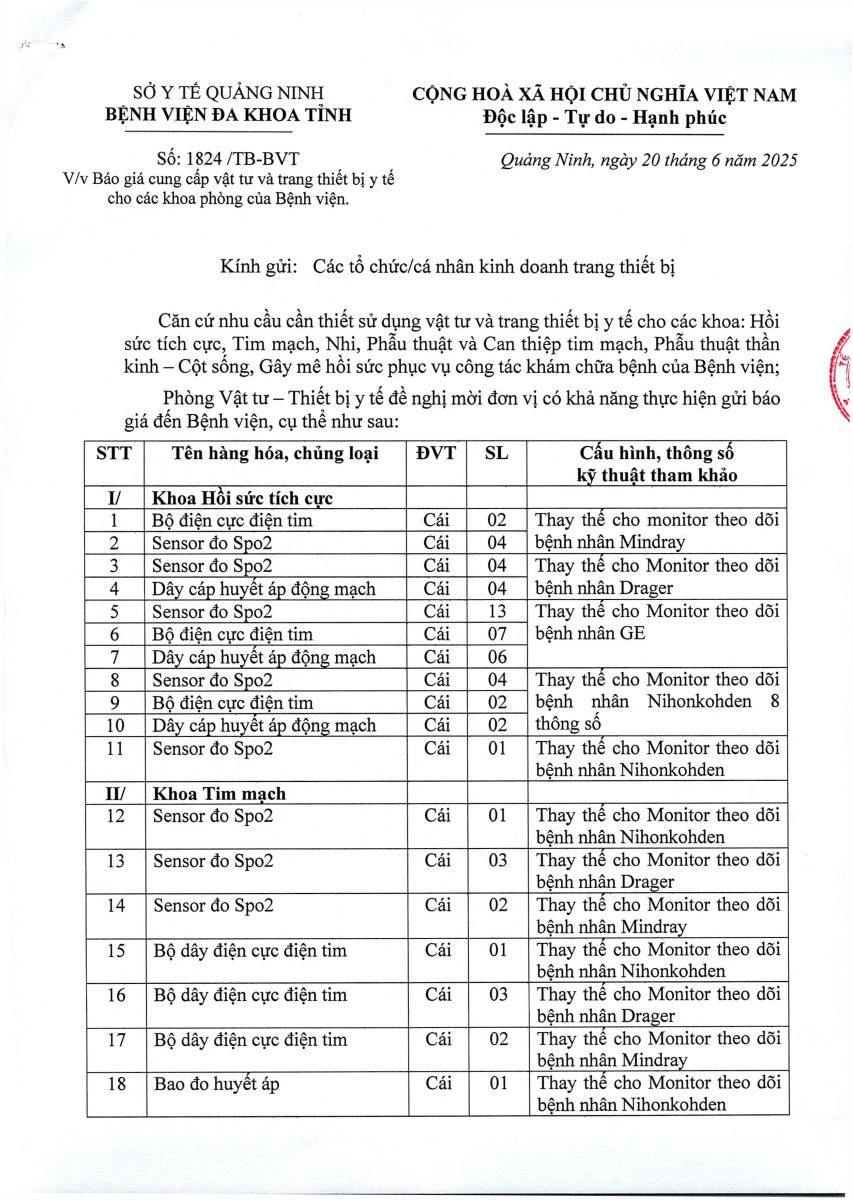 Mời báo giá cung cấp vật tư và trang thiết bị y tế cho các khoa phòng (1824)