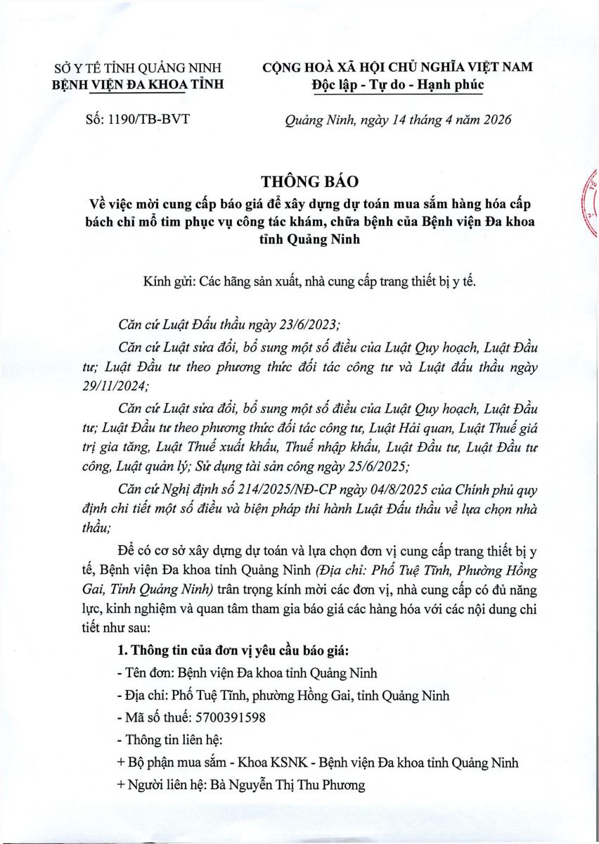 Mời báo giá để xây dựng dự toán mua sắm hàng hoá cấp bách chỉ mổ tim (1190)