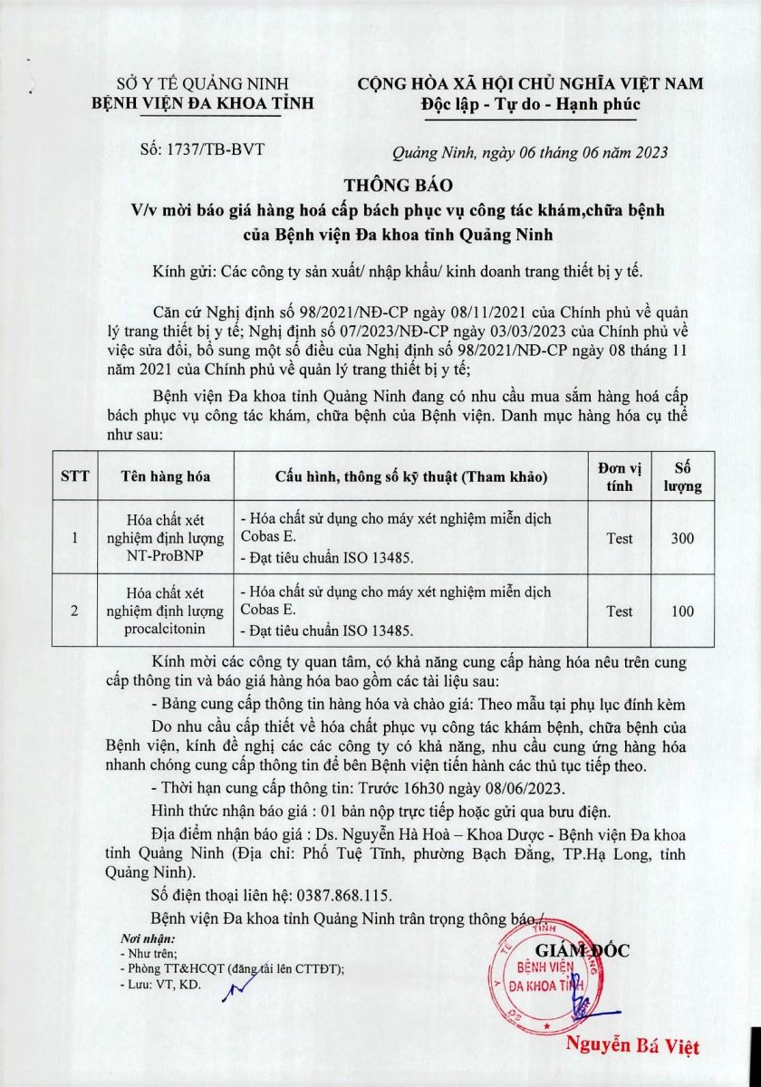 Mời báo giá hàng hóa cấp bách phục vụ công tác khám chữa bệnh (1737)