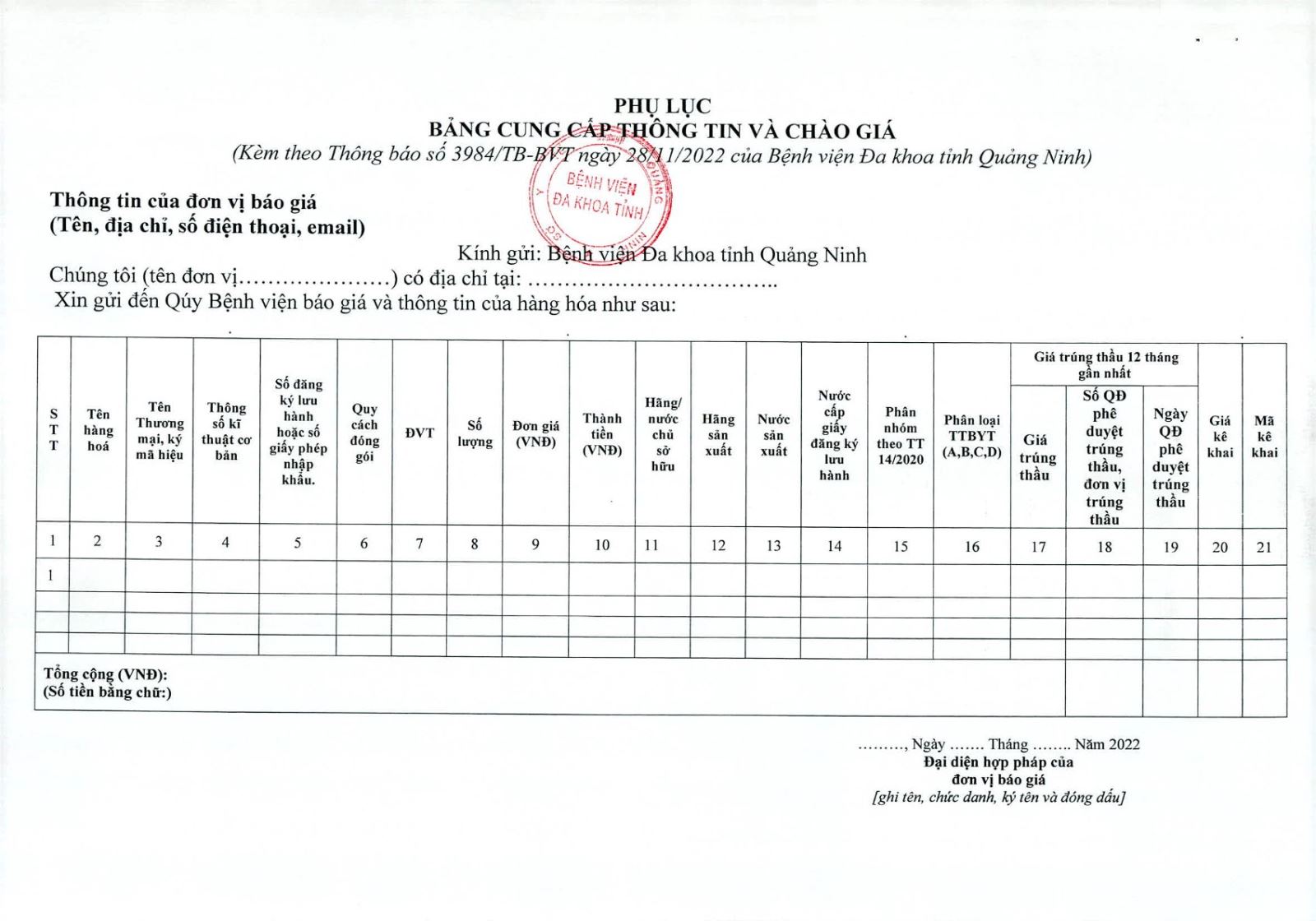 Mời báo giá hàng hoá cấp bách phục vụ công tác khám chữa bệnh (3948)