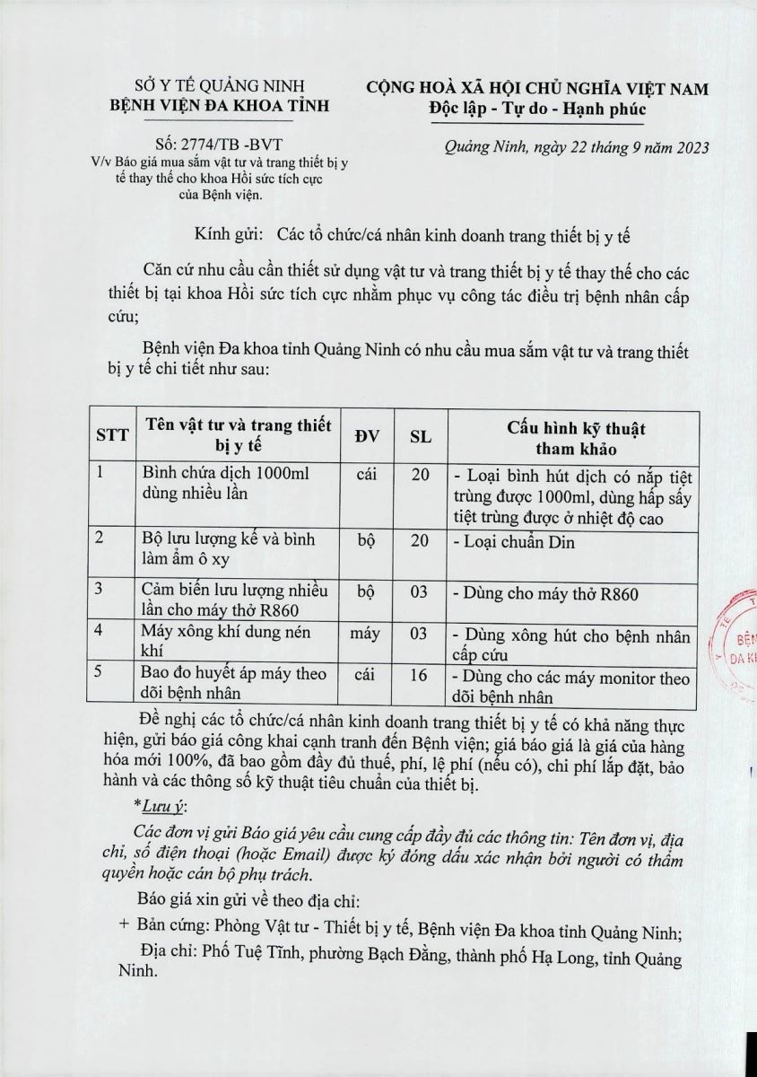 - Mời báo giá mua sắm vật tư và trang thiết bị y tế thay thế cho các khoa (2771)