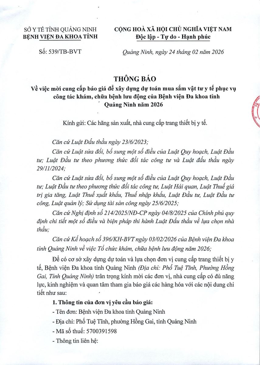 - Thông báo yêu cầu cung cấp báo giá các thiết bị y tế thuộc dự toán thu, chi ngân sách nhà nước năm 2026 đợt 2 (509)