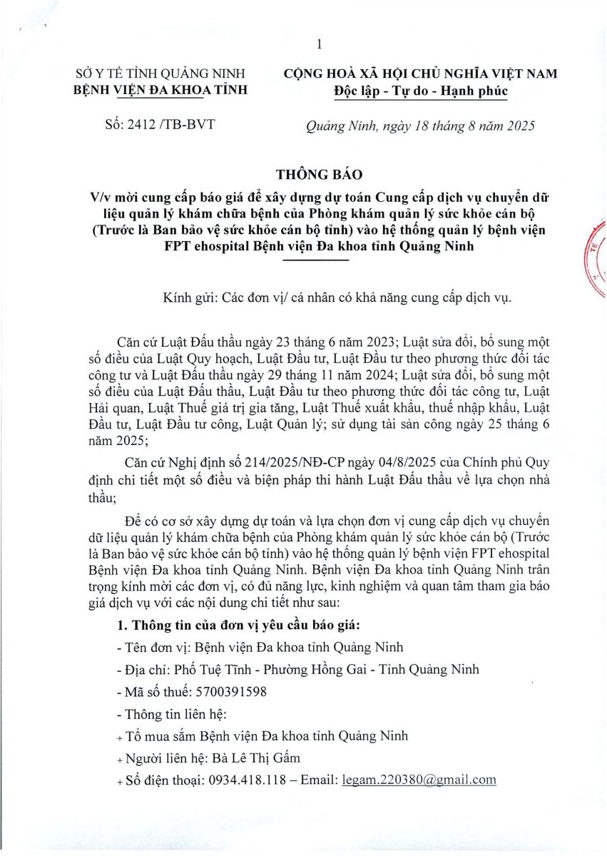 Mời cung cấp báo giá để xây dựng dự toán Cung cấp dịch vụ chuyển dữ liệu quản lý khám chữa bệnh (2412)