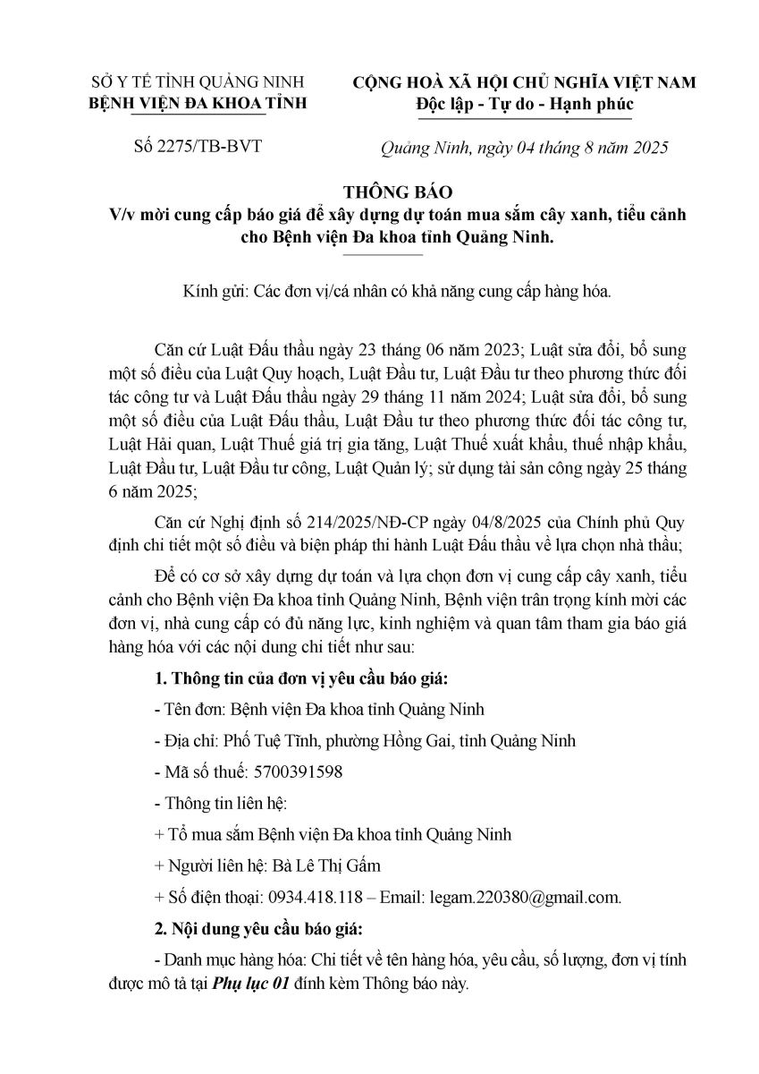 Mời cung cấp báo giá để xây dựng dự toán mua sắm cây xanh, tiểu cảnh (2275)