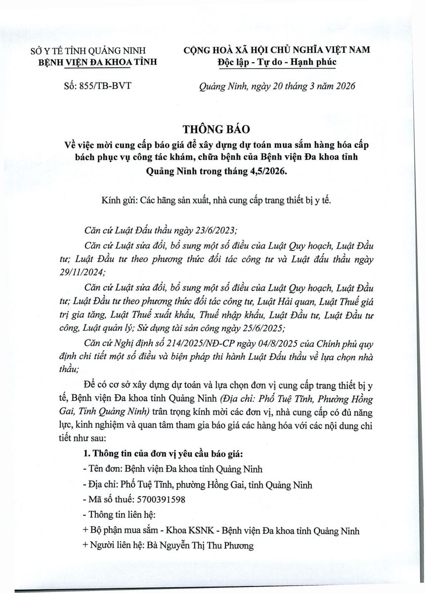 Mời cung cấp báo giá để xây dựng dự toán mua sắm hàng hoá (855)