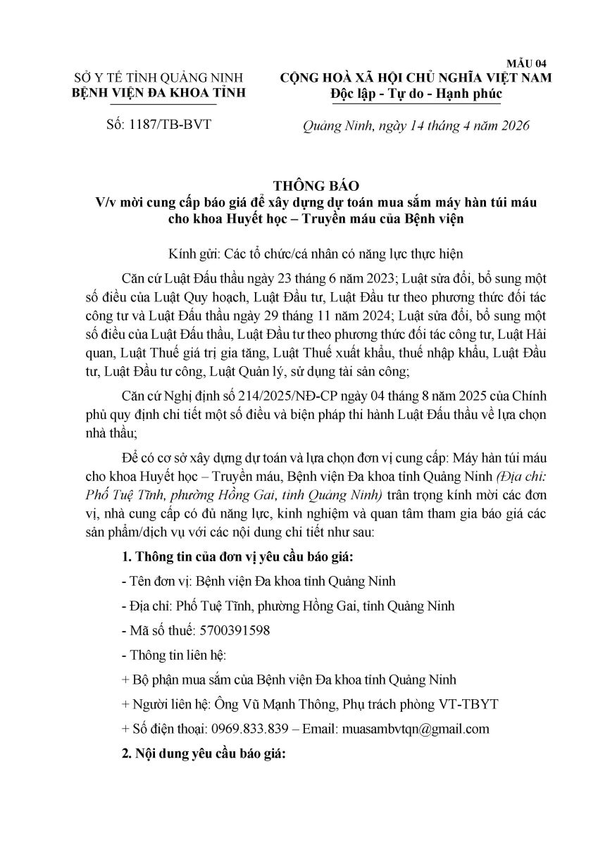 Mời cung cấp báo giá để xây dựng dự toán mua sắm máy hàn túi máu (1187)