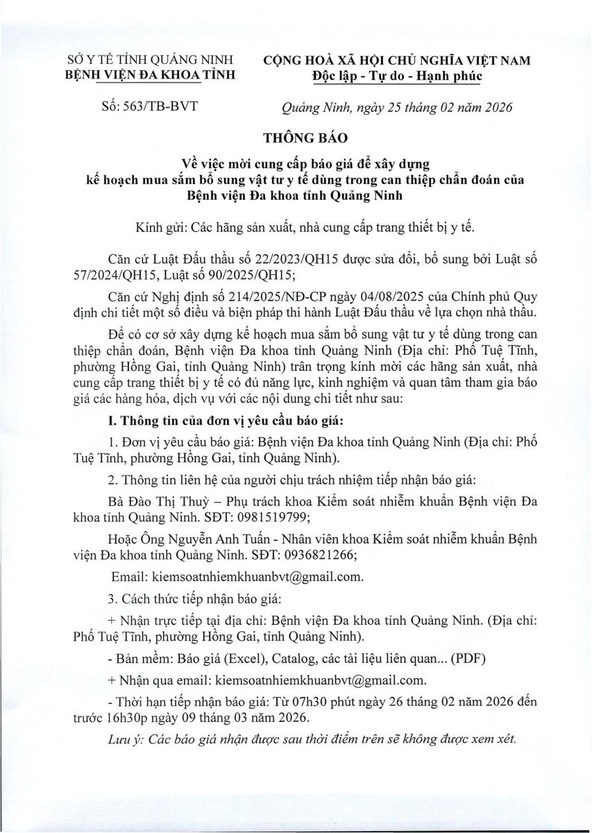 - Thông báo yêu cầu cung cấp báo giá các thiết bị y tế thuộc dự toán thu, chi ngân sách nhà nước năm 2026 đợt 2 (509)