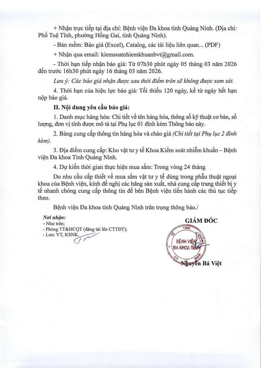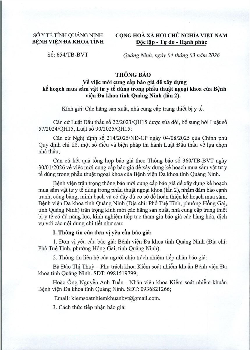 - Thông báo yêu cầu cung cấp báo giá các thiết bị y tế thuộc dự toán thu, chi ngân sách nhà nước năm 2026 đợt 2 (509)