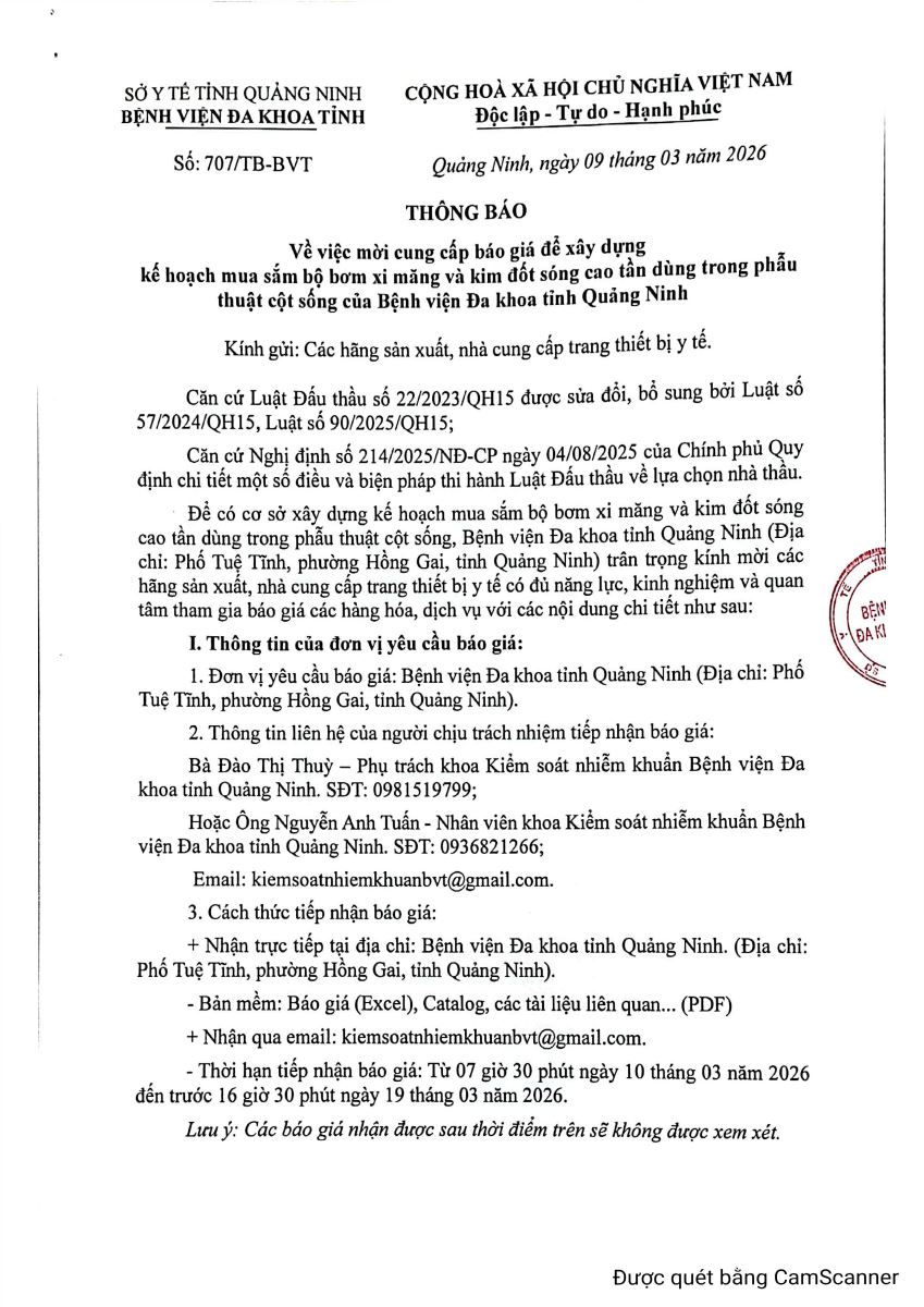 - Thông báo yêu cầu cung cấp báo giá các thiết bị y tế thuộc dự toán thu, chi ngân sách nhà nước năm 2026 đợt 2 (509)