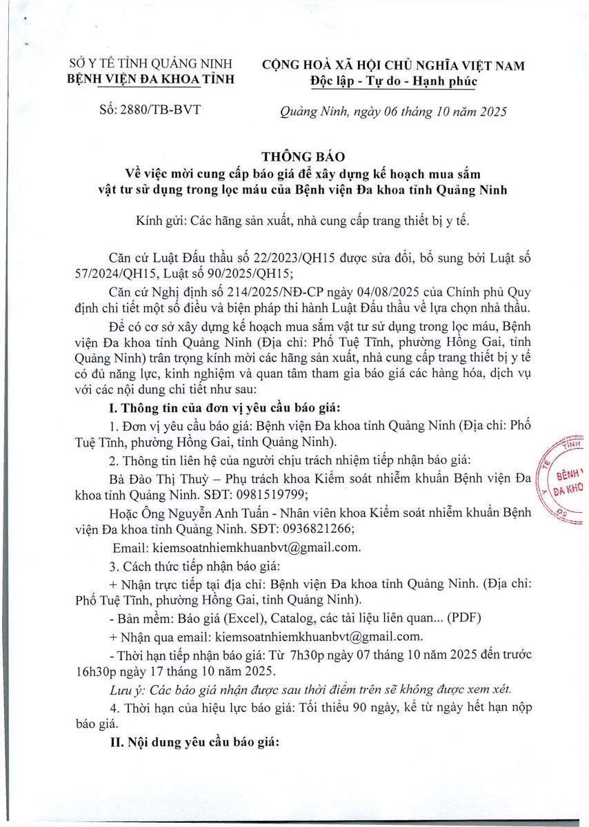 Mời cung cấp báo giá để xây dựng kế hoạch mua sắm vật tư sử dụng trong lọc máu của bệnh viện (2880)