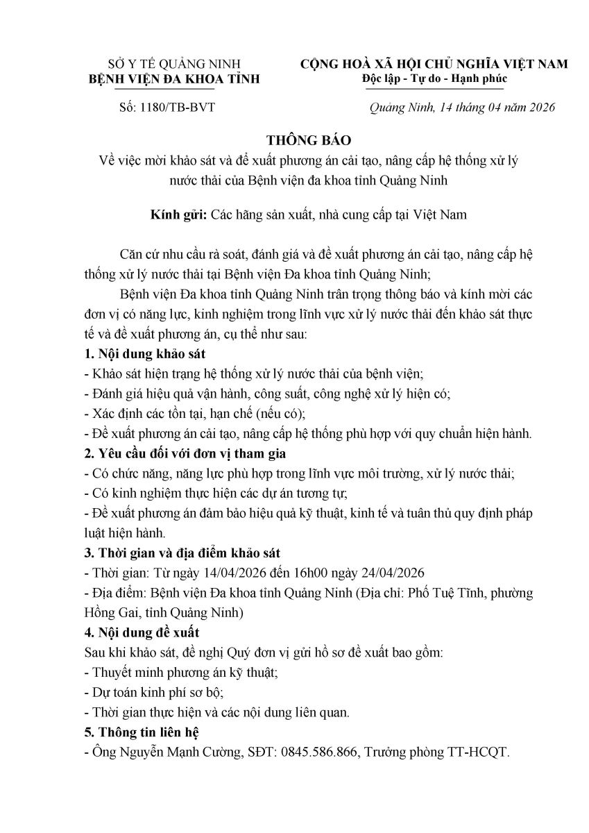 Mời khảo sát và đề xuất phương án cải tạo, nâng cấp hệ thống xử lý nước thải (1180)