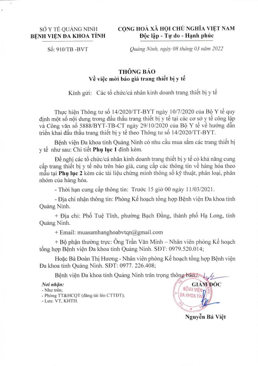 Bệnh viện Đa khoa tỉnh Quảng Ninh ra Thông báo số 910/TB-BVT ngày 08/3/2022 về việc mời báo giá trang thiết bị y tế