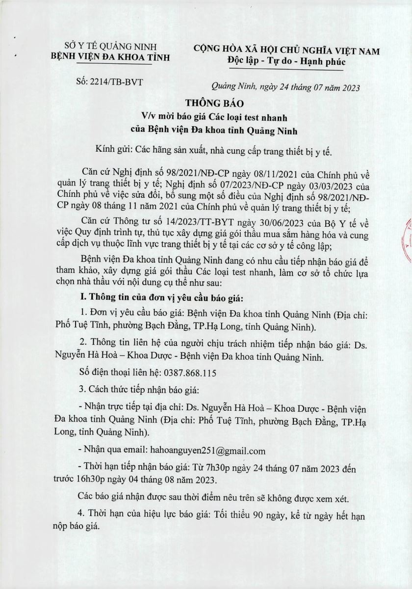 Thông báo mời báo giá thuốc của Bệnh viện Đa khoa tỉnh Quảng Ninh (2214)
