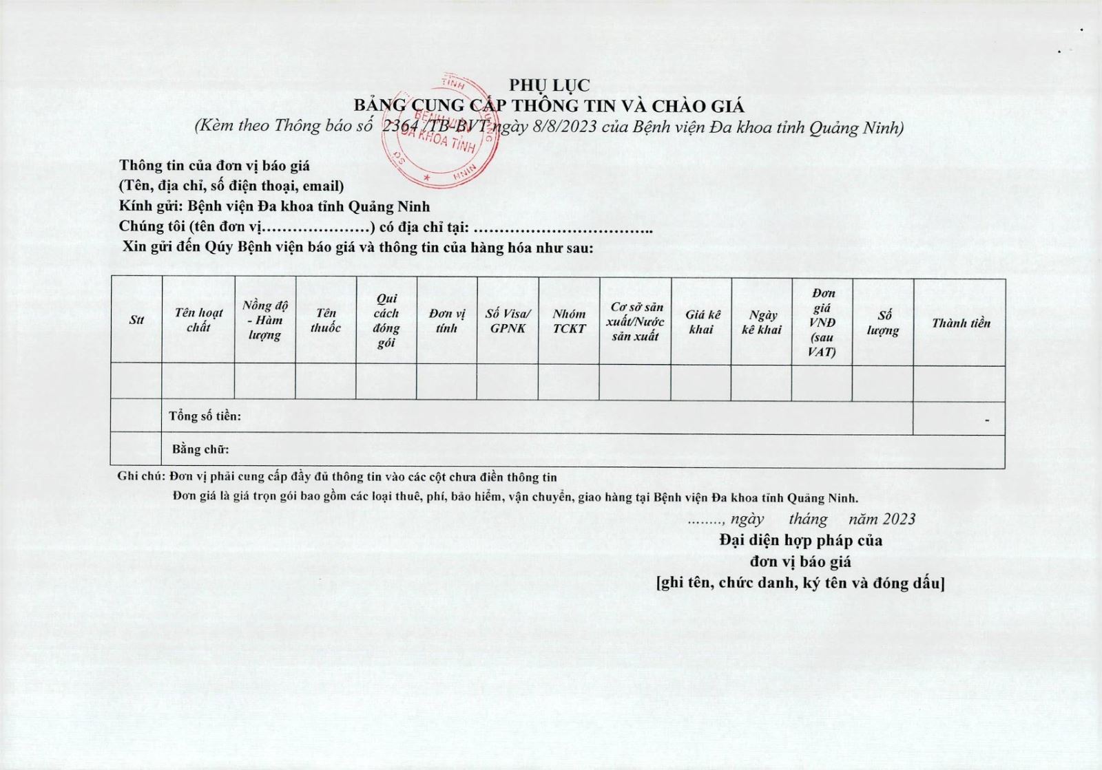 Thông báo mời báo giá thuốc của Bệnh viện Đa khoa tỉnh Quảng Ninh (2364)