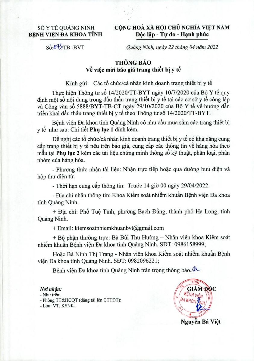 - Thông báo về việc mời báo giá trang thiết bị y tế