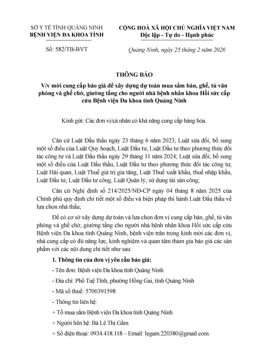 Thông báo mời cung cấp báo giá để xây dựng dự toán (582)
