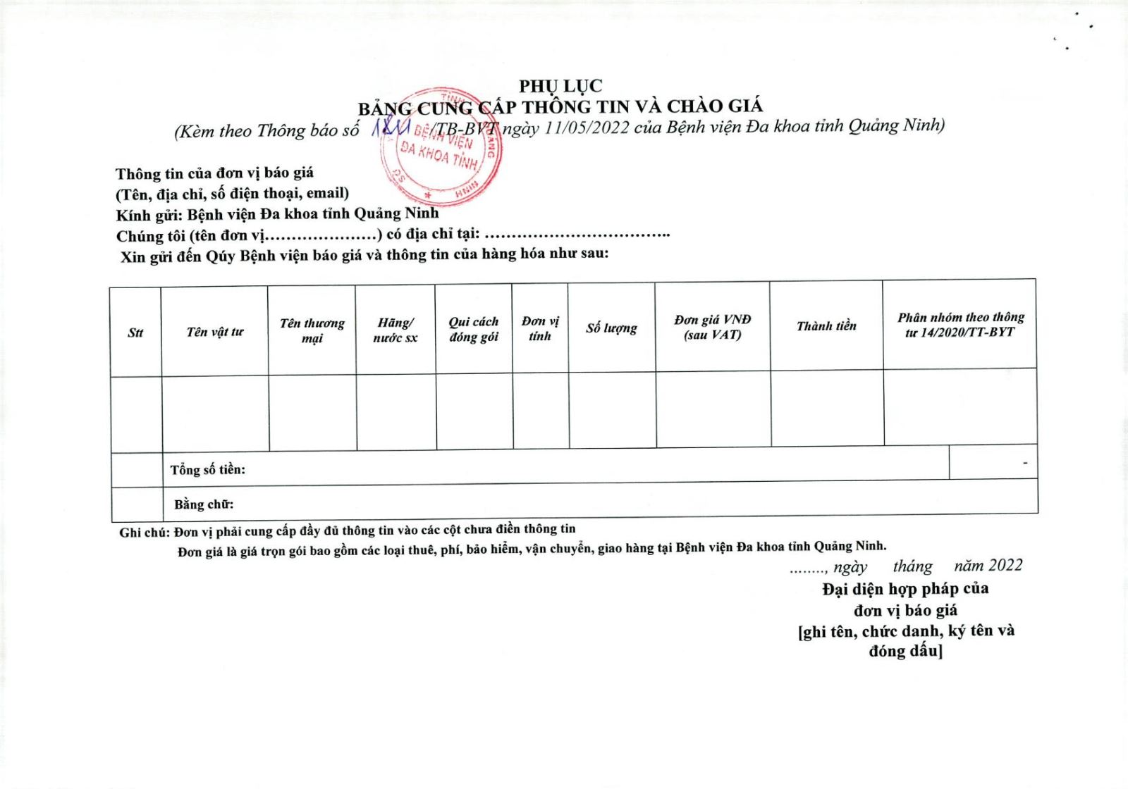 - Thông báo về việc mời báo giá thuốc của Bệnh viện Đa khoa tỉnh Quảng Ninh (Thông báo số 1842-TB/BVT)
