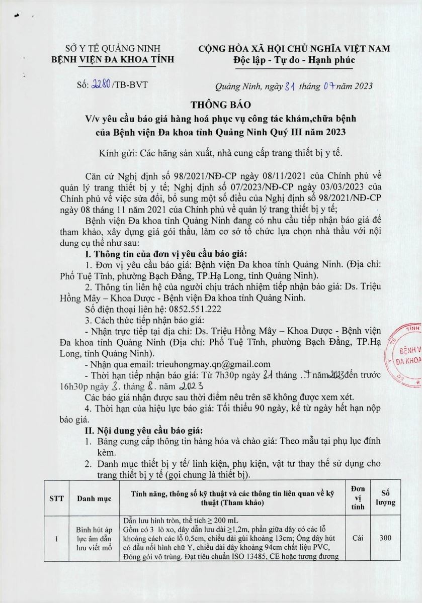 Thông báo yêu cầu báo giá hàng hóa phục vụ công tác khám, chữa bệnh (2280)